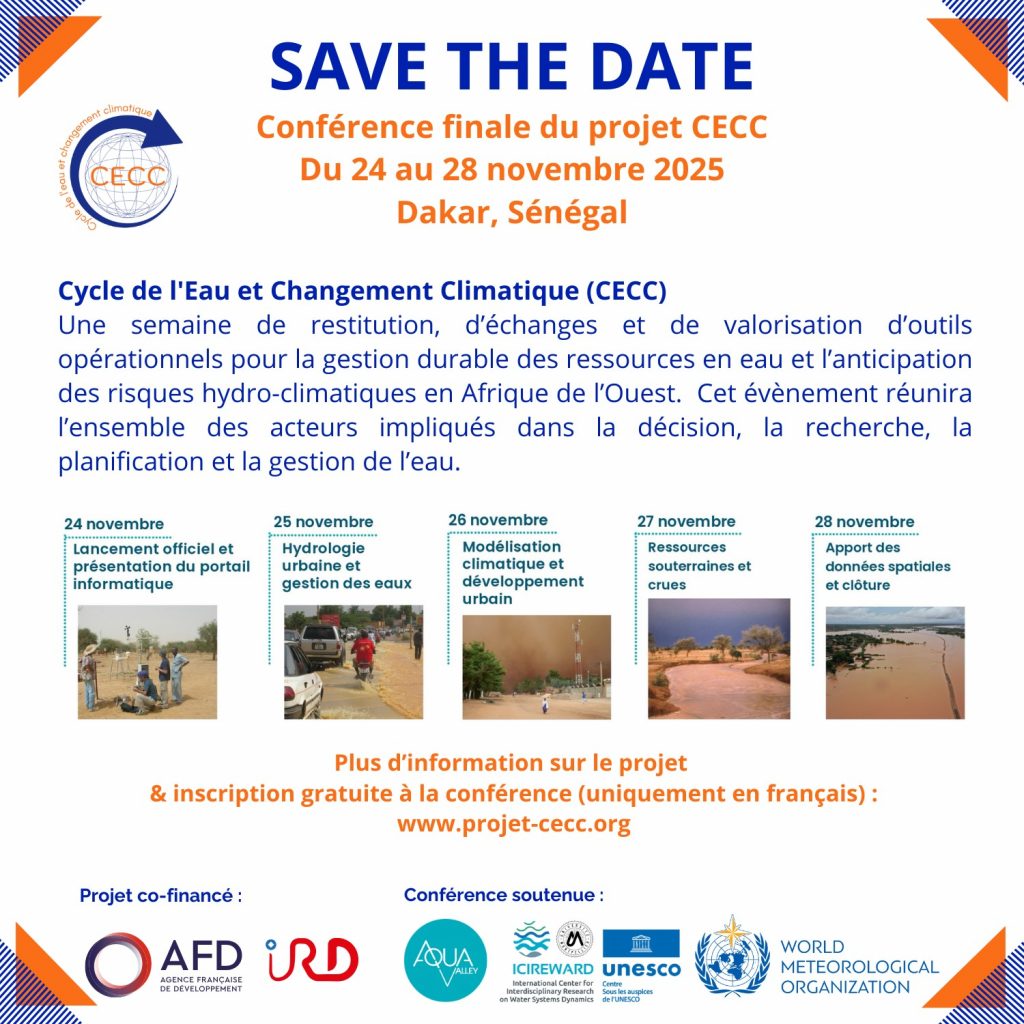 Le projet Cycle de l’Eau et Changement Climatique (CECC), mis en œuvre depuis 2021 par l’Institut de Recherche pour le Développement (IRD) et ses partenaires du Sud, et cofinancé par l’Agence Française de Développement (AFD), a été mis sur pied pour actualiser les connaissances et fournir des outils pour la gestion actuelle et future du risque hydro-climatique et de la ressource en eau, dans la zone intertropicale, avec un focus sur l’Afrique de l’Ouest et la région Andine. La conférence finale CECC qui se tiendra du 24 au 28 novembre 2025 à l’Université Cheikh Anta Diop de Dakar (Sénégal) vise à présenter les outils développés au cours des 4 années du projet à un large éventail d’utilisateurs (académiques, bureaux d’études, gestionnaires, décideurs publics, etc.). La participation est possible en présentiel, sur inscription : toutes les informations peuvent être trouvées ici